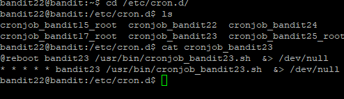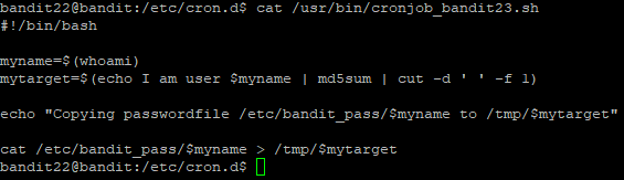 쉘스크립트로 이루어진 cron 이네요 echo I am user bandit23 | md5sum | cut -d ' ' -f 1 명령어를 이용해