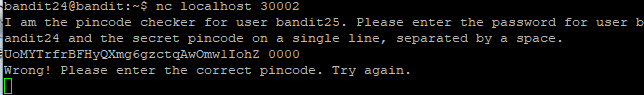 포트 30002 에서 bandit24에 대한 비밀번호와 어떤숫자 4자리를 대입하여 저장된값이 맞으면 bandit25의 접속 비밀번호를 제공하는데 어떤숫자 4자리를 무차별 대입 공격으로 풀어보는 문제인것 같습니다.