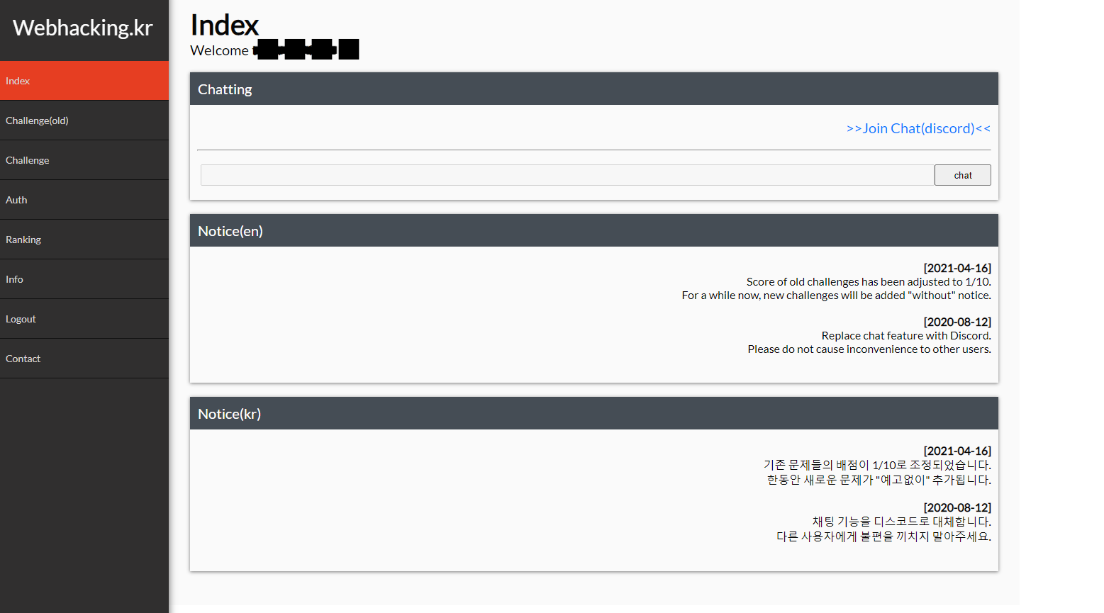 Index Welcome Stranger! Chatting Notice(en) [2021-04-16] Score of old challenges has been adjusted to 1/10. For a while now, new challenges will be added "without" notice. [2020-08-12] Replace chat feature with Discord. Please do not cause inconvenience to