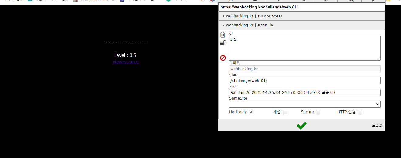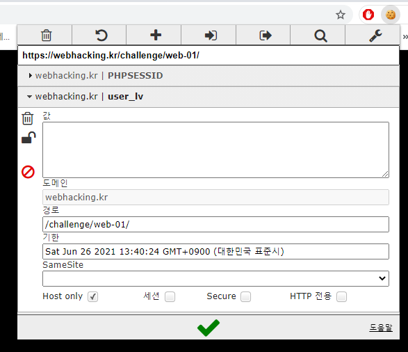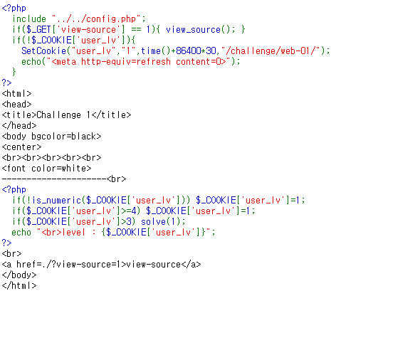 if(!$_COOKIE['user_lv']){ SetCookie("user_lv","1",time()+86400*30,"/challenge/web-01/"); echo("<meta http-equiv=refresh content=0>"); }만약 user_lv 이라는 이름의 쿠키가 없다면