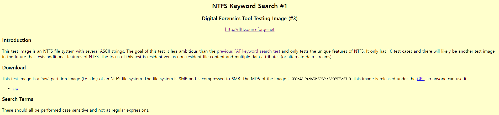 NTFS Keyword Search #1 Digital Forensics Tool Testing Image (#3) http://dftt.sourceforge.net Introduction This test image is an NTFS file system with several ASCII strings. The goal of this test is less ambitious than the previous FAT keyword search test a