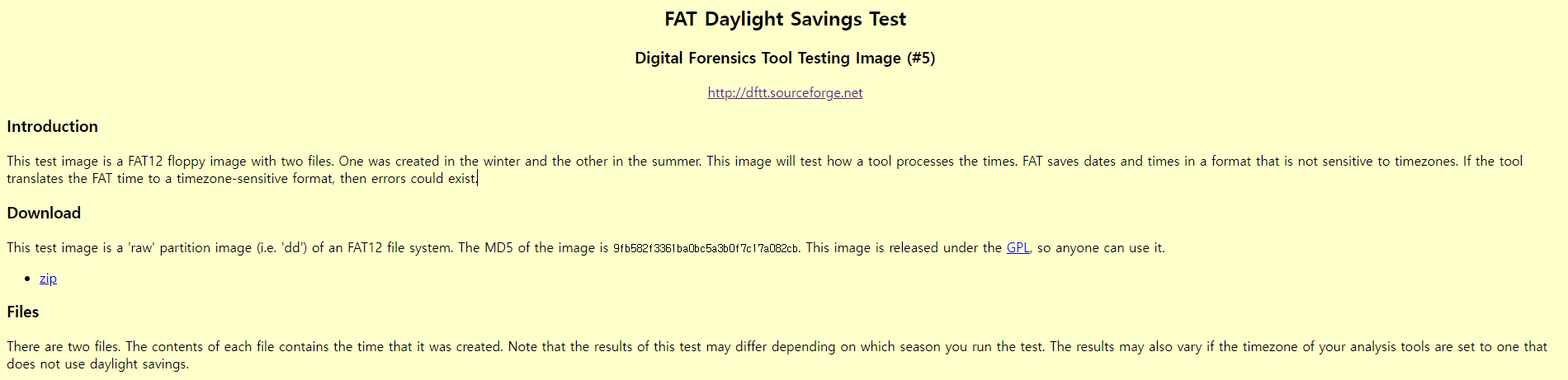 FAT Daylight Savings Test Digital Forensics Tool Testing Image (#5) http://dftt.sourceforge.net Introduction This test image is a FAT12 floppy image with two files. One was created in the winter and the other in the summer. This image will test how a tool