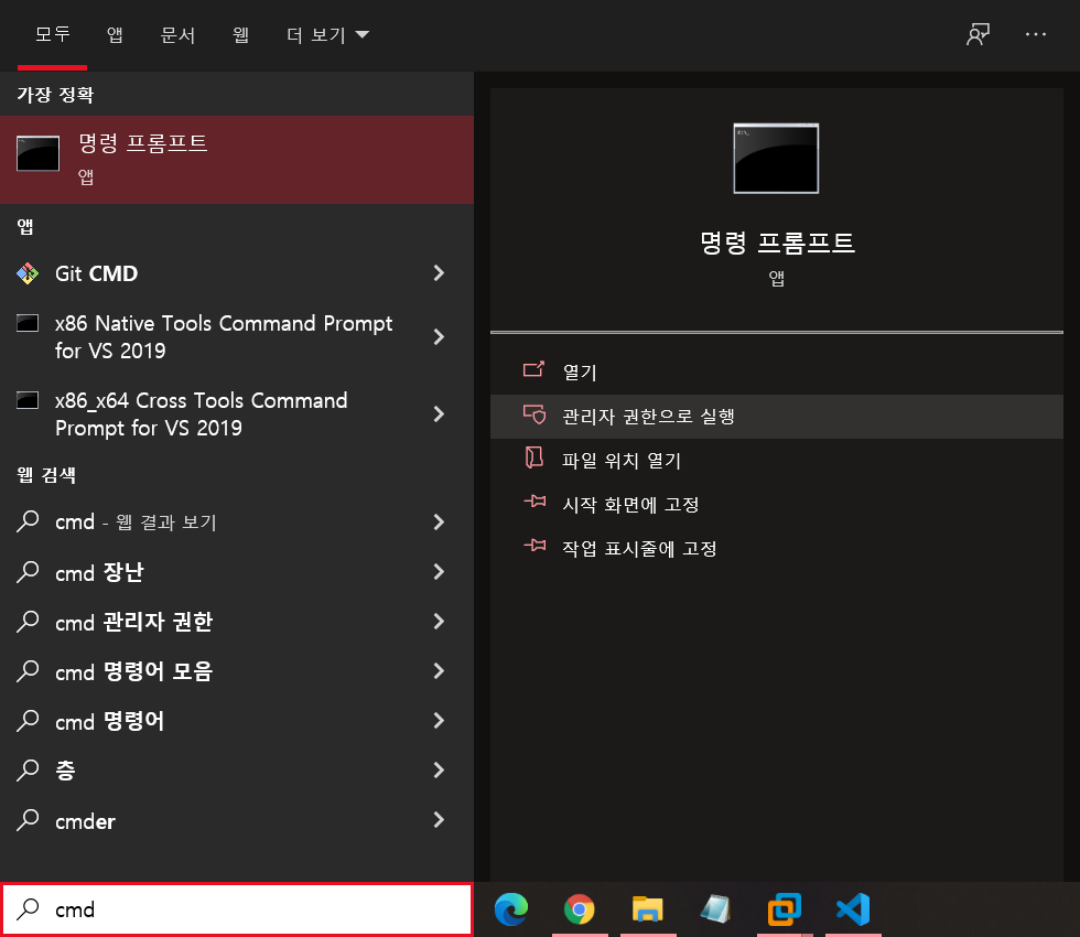 명령프롬포트(cmd)를 관리자 권한으로 실행시켜줍니다.