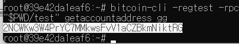 bitcoin-cli -regtest -rpcuser=test -rpcpassword=test -rpcport=12345 -rpcconnect=127.0.0.1 -datadir="$PWD/test" getnewaddress명령어 제일 뒤에 닉네임을 만들어줍니다. 저는 gg로 했습니다.