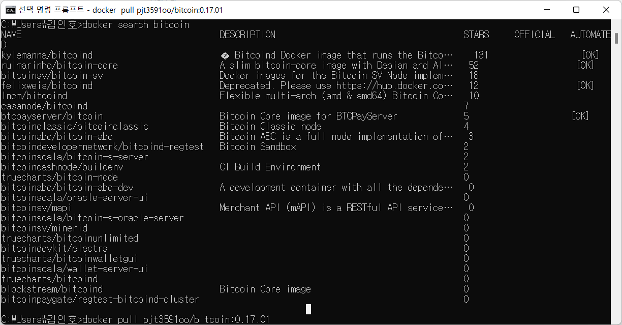 저는 pjt3591oo/bitcoin:0.17.01 파일을 pull 해오겠습니다.